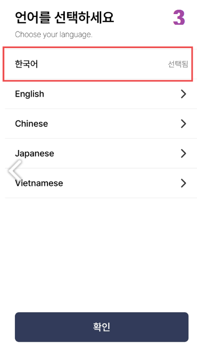 3. 언어 선택시 "한국어"를 선택합니다.