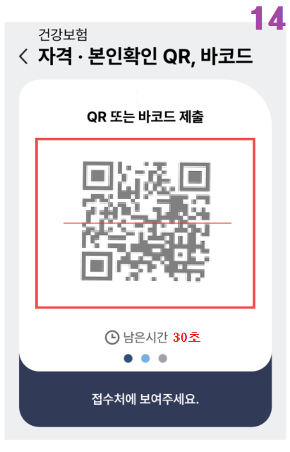 병원 방문시, 모바일 건강보험증 앱에서 "QR 제출"을 클릭하면 30초 동안 유효한 QR코드가 생성됩니다.