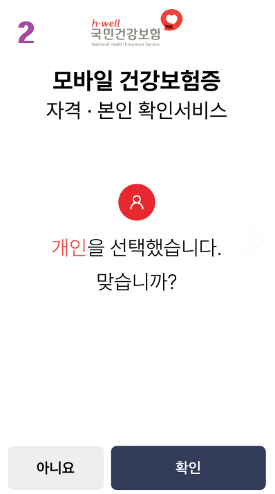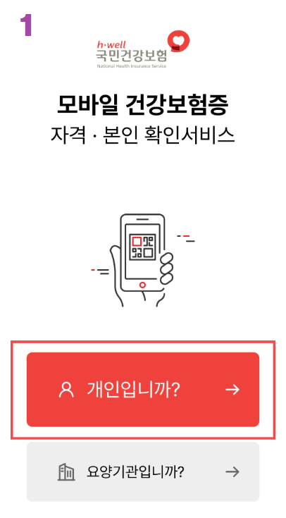 2. 모바일 건강보험증 앱을 실행한 후, "개인입니다"를 선택합니다.